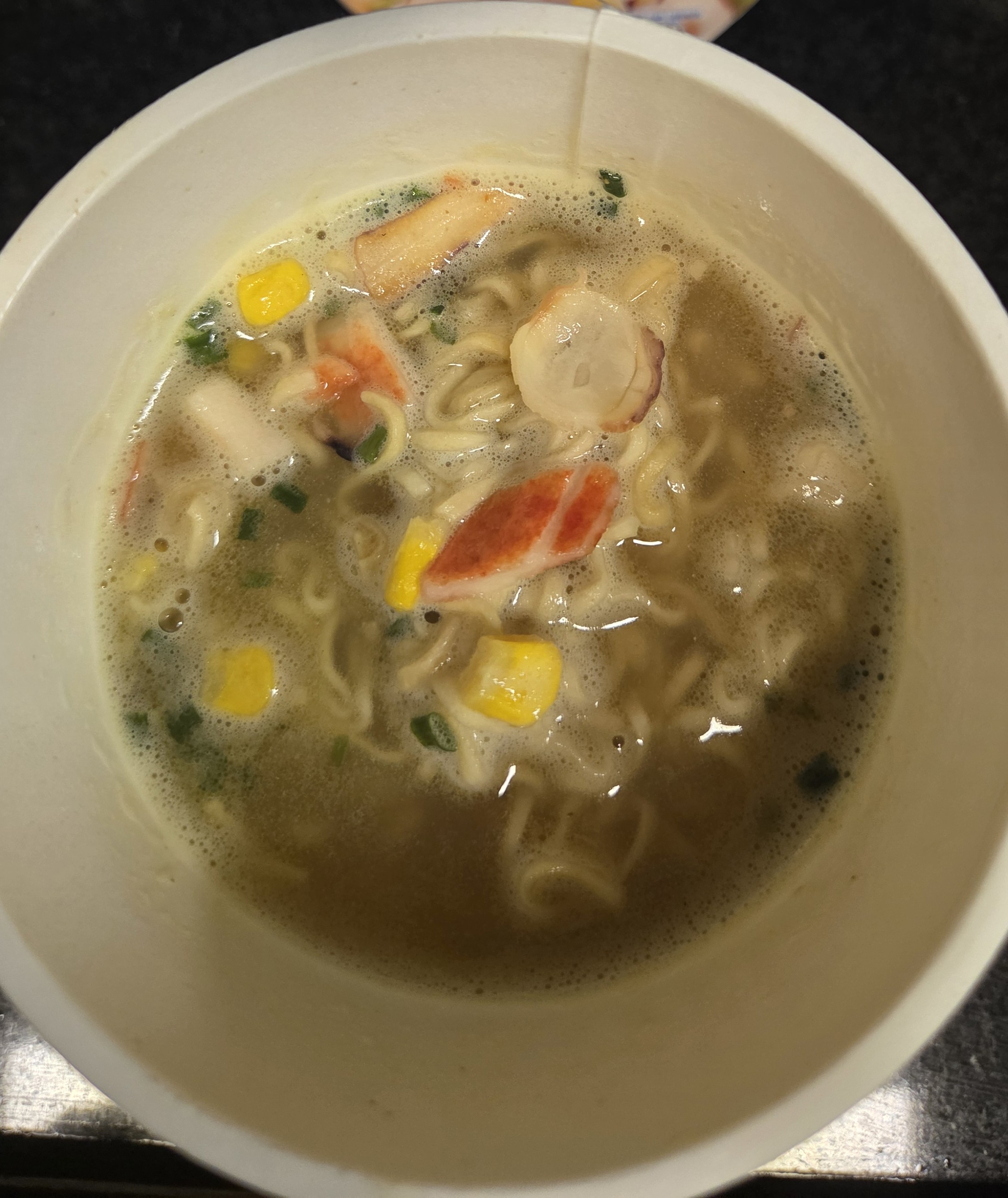 옥수수, 맛살 등 건더기가 꽤 풍성하며 국물은 맑고 뽀얀 편입니다.